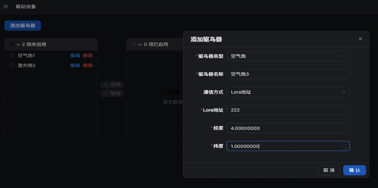 系统连接各种驱鸟设备,包括空气炮、激光、声波等,通过联动设备模块和任务管理模块,可根据鸟情实时数据,自动启动特定区域的驱鸟设备,优化驱鸟策略,提高驱鸟效率。
