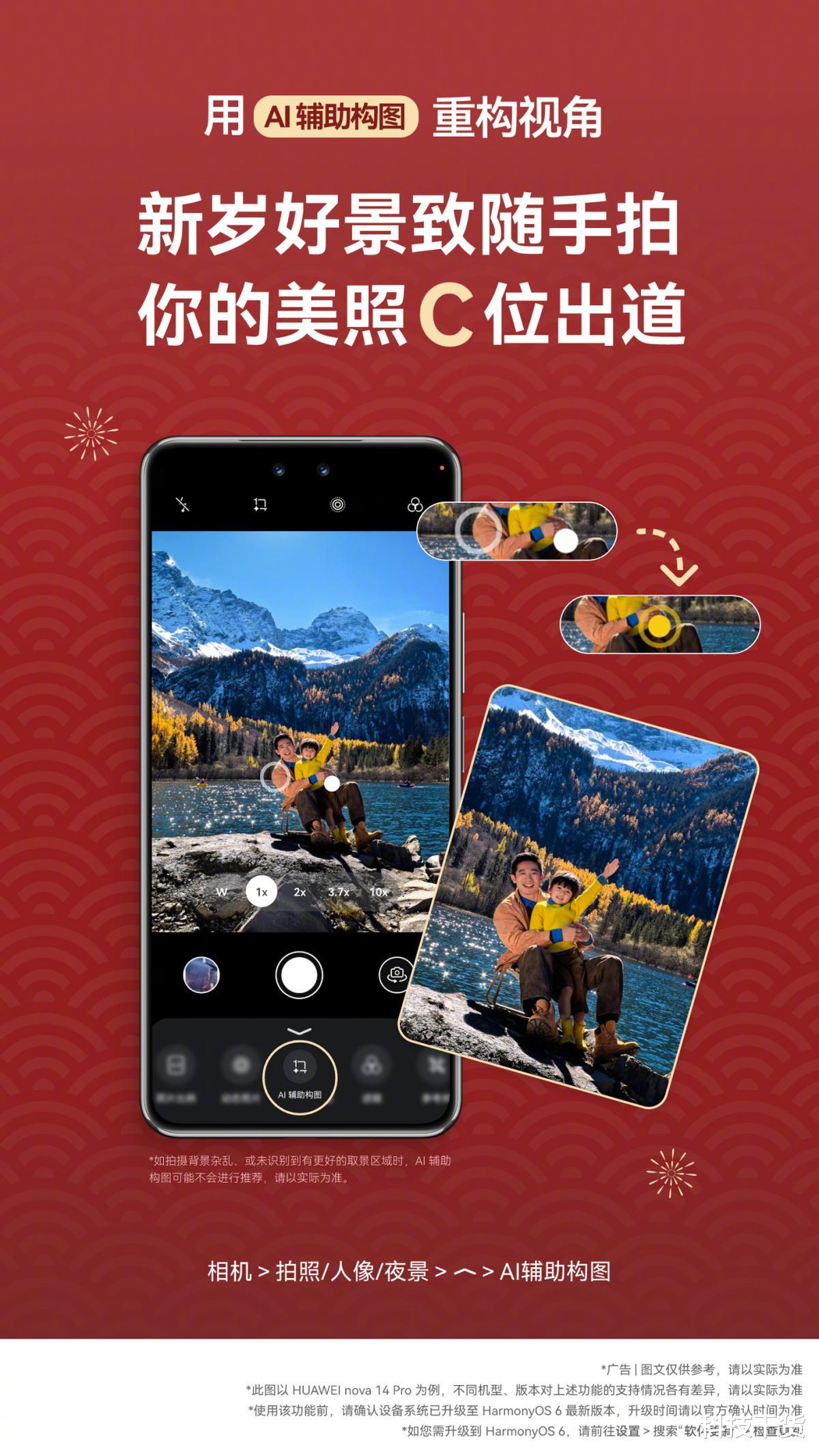 对于摄影初学者,拍照构图也是一大难题。对此,鸿蒙操作系统 6还有AI辅助构图功能,它就像一个随身摄影导师,无论是风景、人像还是建筑拍摄,系统都能识别场景类型,并智能推荐最佳拍摄角度和构图方式。这项功能可以一步步引导用户完成拍摄,帮助轻松实现具有专业透视感的作品。即便是不熟悉摄影的新手,也能在新年旅行中轻松拍出质感大片,真正让拍摄变得更简单、更高效。
