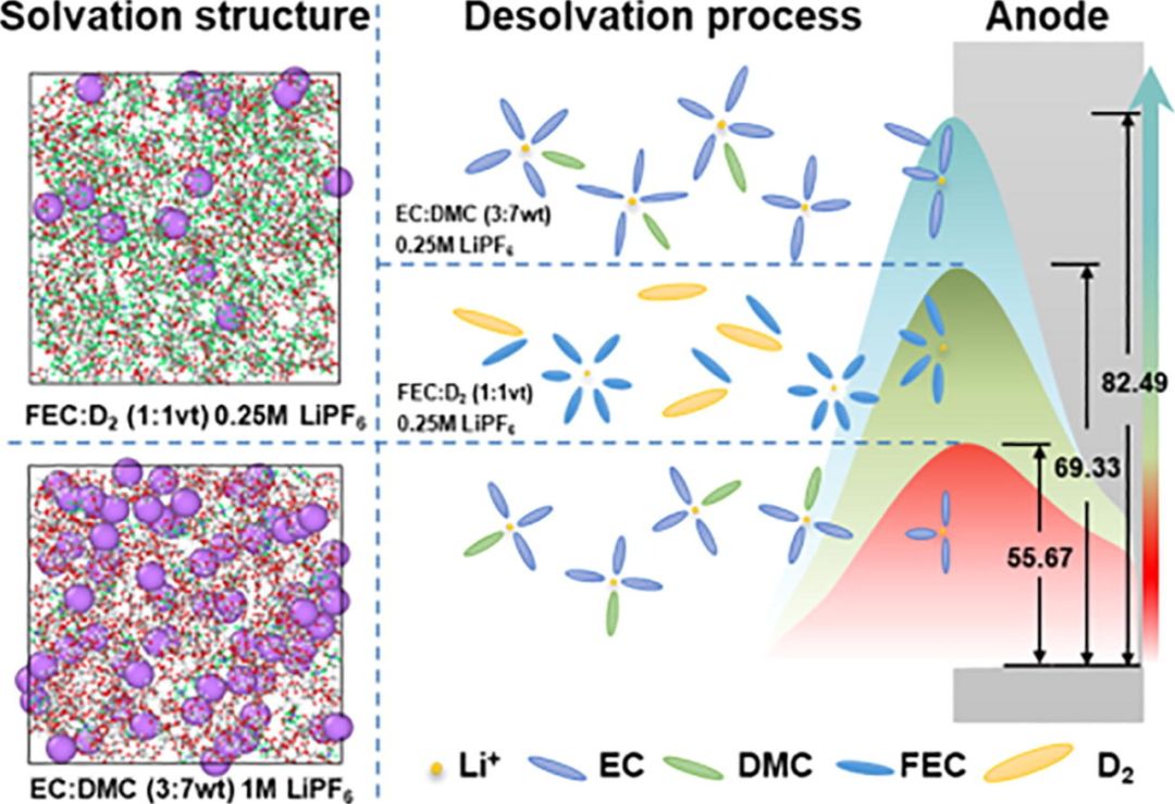 例如,分子动力学模拟和实验证明,低溶剂化能力的溶剂FEC不仅降低了对Li+的去溶剂化能量并改善了电池动力学,但也促进了阻碍电解液消耗的富含LiF的SEI的形成,尽管MD适用于大体系模拟,但其忽略量子效应,需结合DFT以提高精度。
