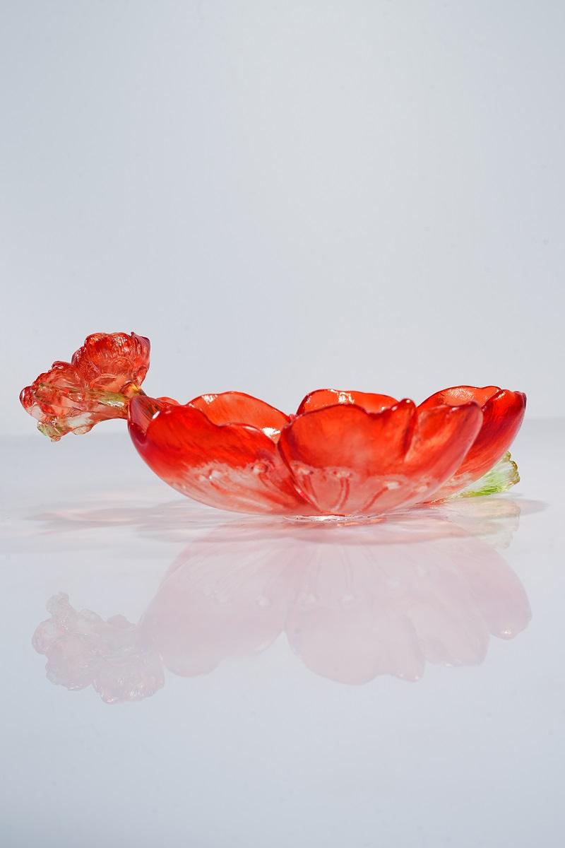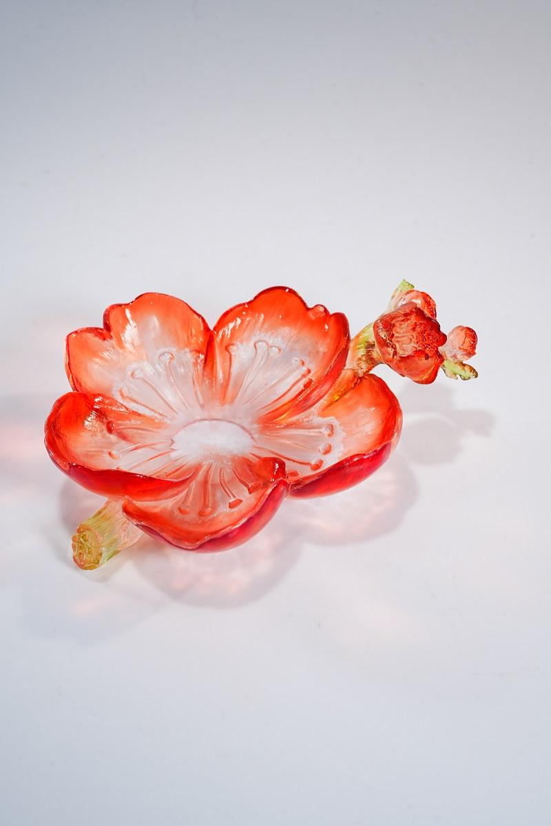 桃花象征着温润与圆满,与琉璃的纯净相得益彰,既守护着茶器、防止滑落,又为茶席增添一抹灵动气息,让平凡的饮茶时光多了几分浪漫意境,契合东方人对美好事物的向往。