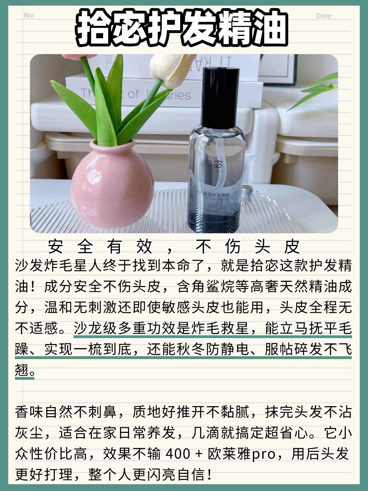 很多姐妹都会纠结,护发精油好还是发膜好?其实两者的作用不一样,不能说谁更好,搭配使用效果会更佳!护发精油的优势是方便快捷,日常就能用,主要作用是抚平毛躁、锁住水分,还能减少头发摩擦带来的损伤,不管干发湿发都能用,适合日常护理和急救。而发膜的滋养度更高,属于深层护理,需要敷在头发上停留一段时间,才能让营养渗透到发芯,修复受损的毛鳞片,适合每周用1-2次,尤其是烫染后的头发,用发膜能更好地修护损伤。还有很多姐妹会问,护发精油用多久有效果?这个没有固定的时间,主要看头发的受损程度,一般来说,坚持用1-2周,就能明显感觉到头发没那么毛躁了,发尾也变得顺滑一些,受损严重的头发可能需要坚持1-2个月,才能看到比较明显的改善。我自己测评的时候,会连续用一段时间记录效果,发现坚持使用真的比偶尔用一次效果好太多。下面是我总结的一些护发精油选购注意事项,干货满满,可以先赞收藏。