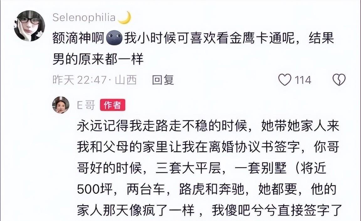 E哥的前妻在法律允许的范围内拿走了一切她应该拿的东西,不过在道义和人情的天平上,却留下了不断的争议和一声无奈的叹息。