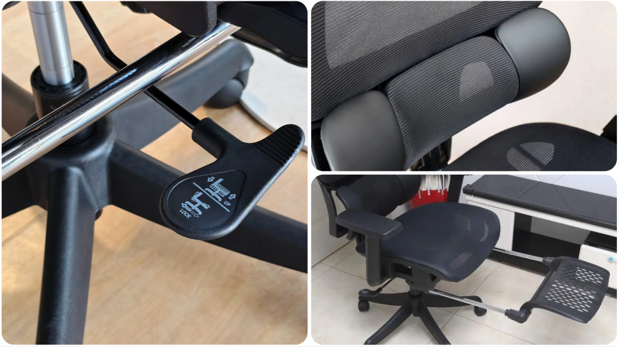 调节能力:扶手能多方向调节,还能跟着椅背后仰联动,靠背最大后仰145度,多档锁定,头枕、坐垫能调节,有可伸缩脚踏,线控调节操作方便;缺点是脚踏伸缩幅度不大,身高较高的人午休时可能不够舒展。