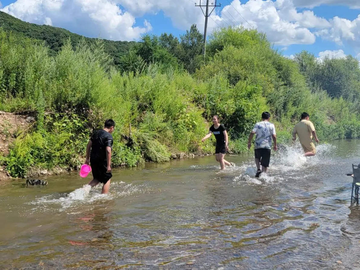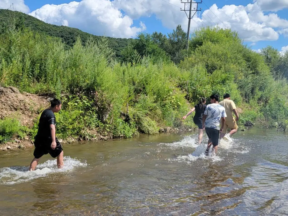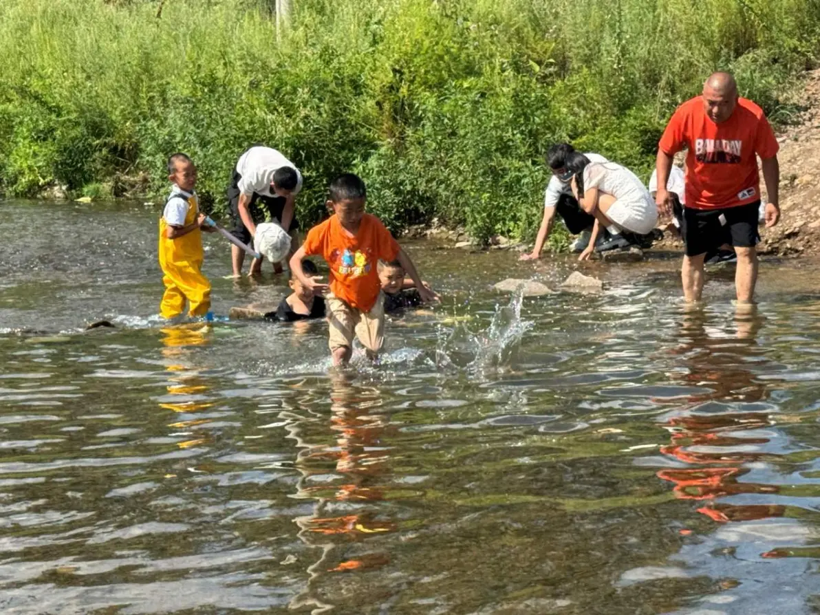 刚来的时候,水有点凉,孩子们都放不开,到了中午,阳光在头顶,水温也上来了,那就是激情时刻了,打水仗,抓鱼,摸虾