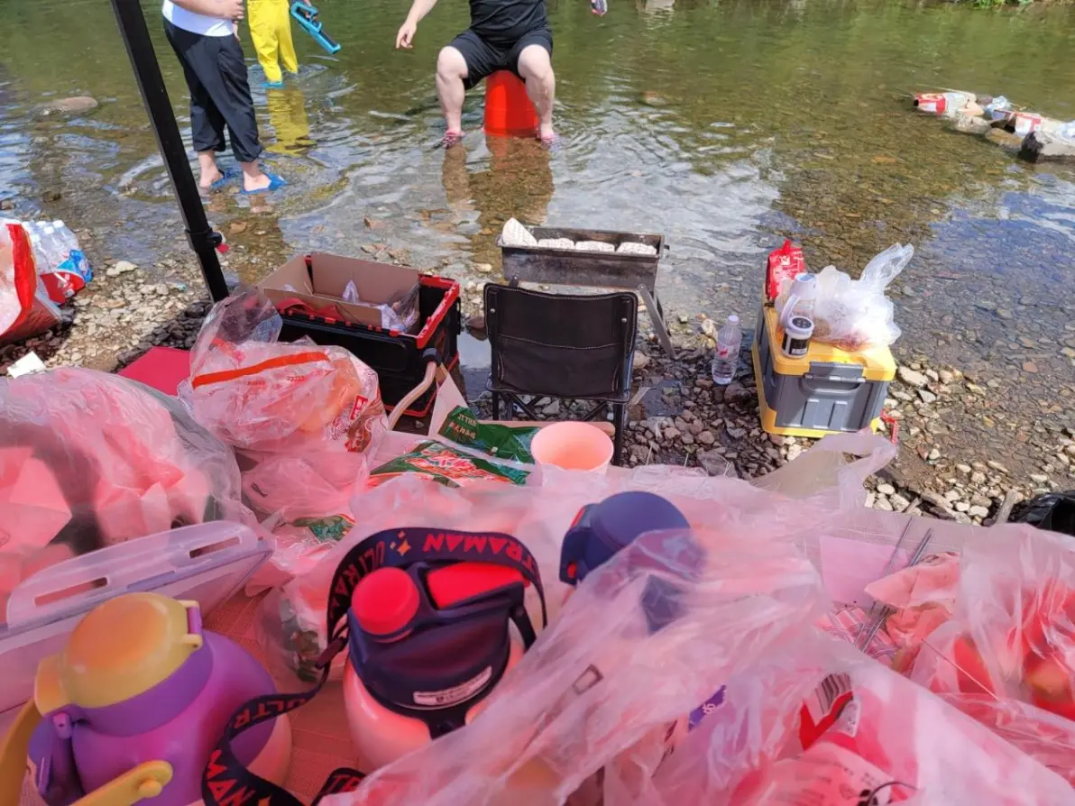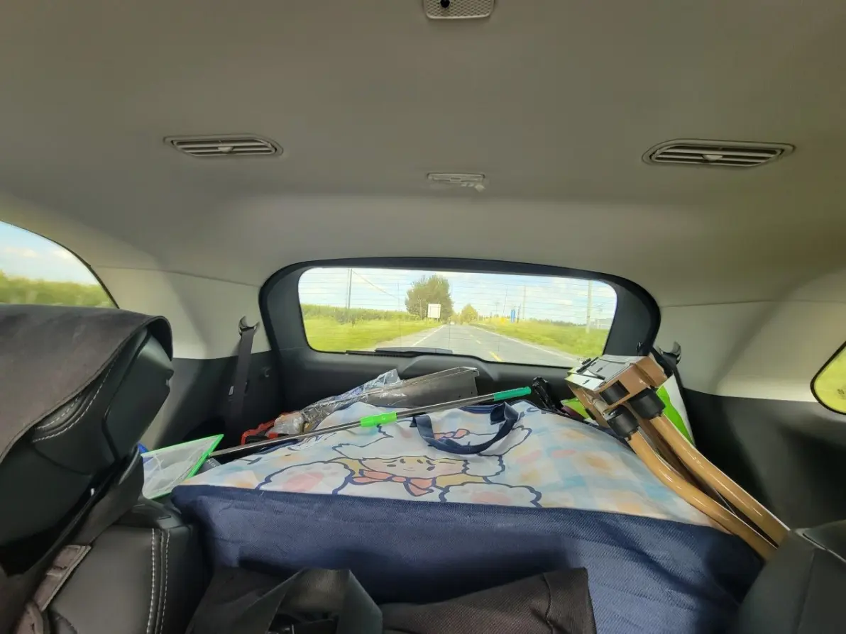 我家车是2+2+3的座椅排布形式,三排放倒的情况下,后备箱的空间就得到了扩充,两个整理箱是这次露营的战备粮,其余的就是装备了,帐篷,蛋卷桌,折叠椅,还有孩子的水枪和捞鱼网,出发,双龙村