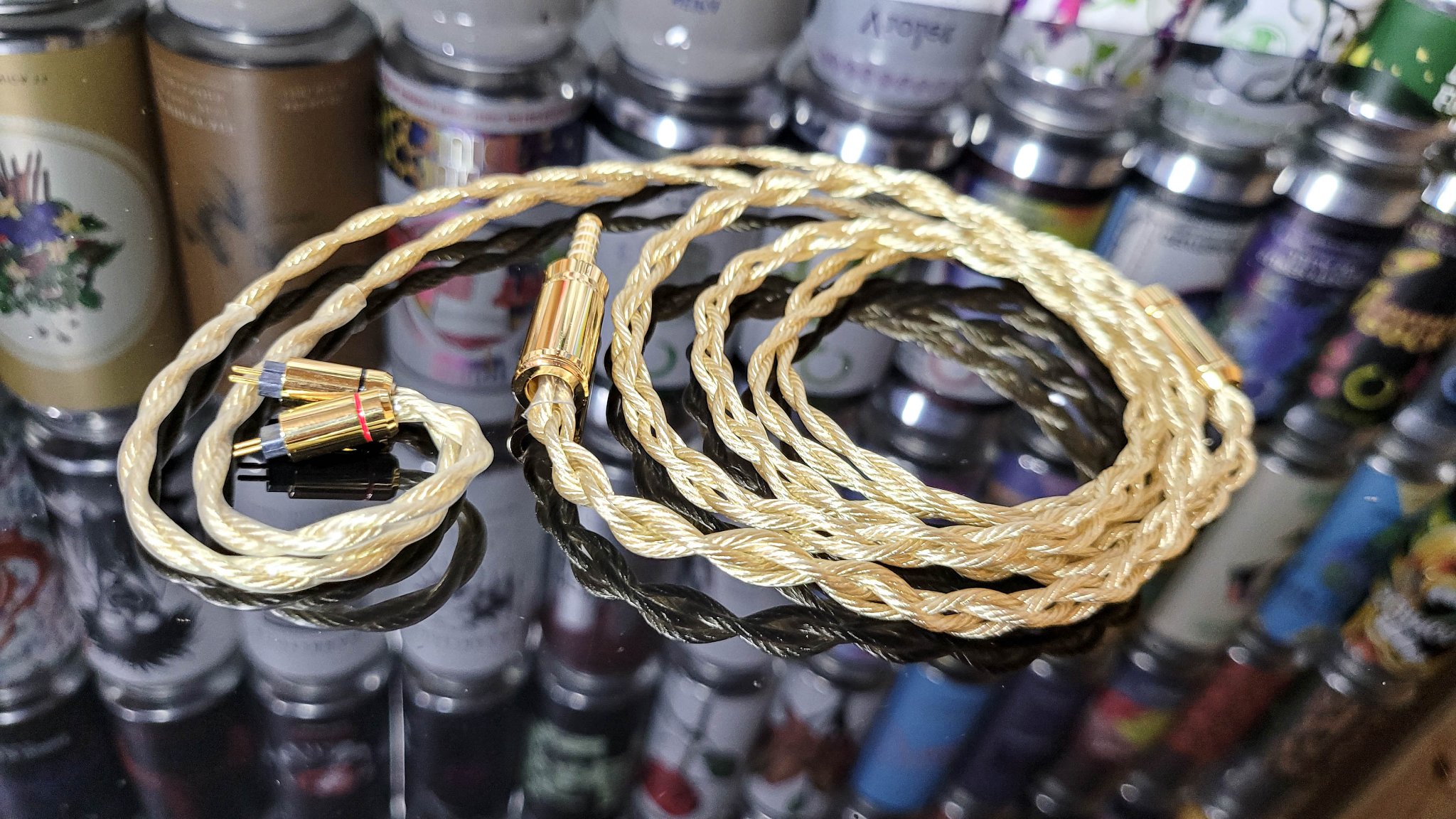 基本情况简单交代一下,煌的材质选择了6N纯银+7N超纯单晶铜镀银镀金双层电镀的复杂线基材料配置,18.6AWG超大线径,上手可感受到用料之充足,尤其金属件部分,不论是套管还是插头插针,全套均采用OFC镀金,上手除了观感相当金闪闪金灿灿,富贵气息溢出之外,分量感还是很足,易开脑放(狗头)