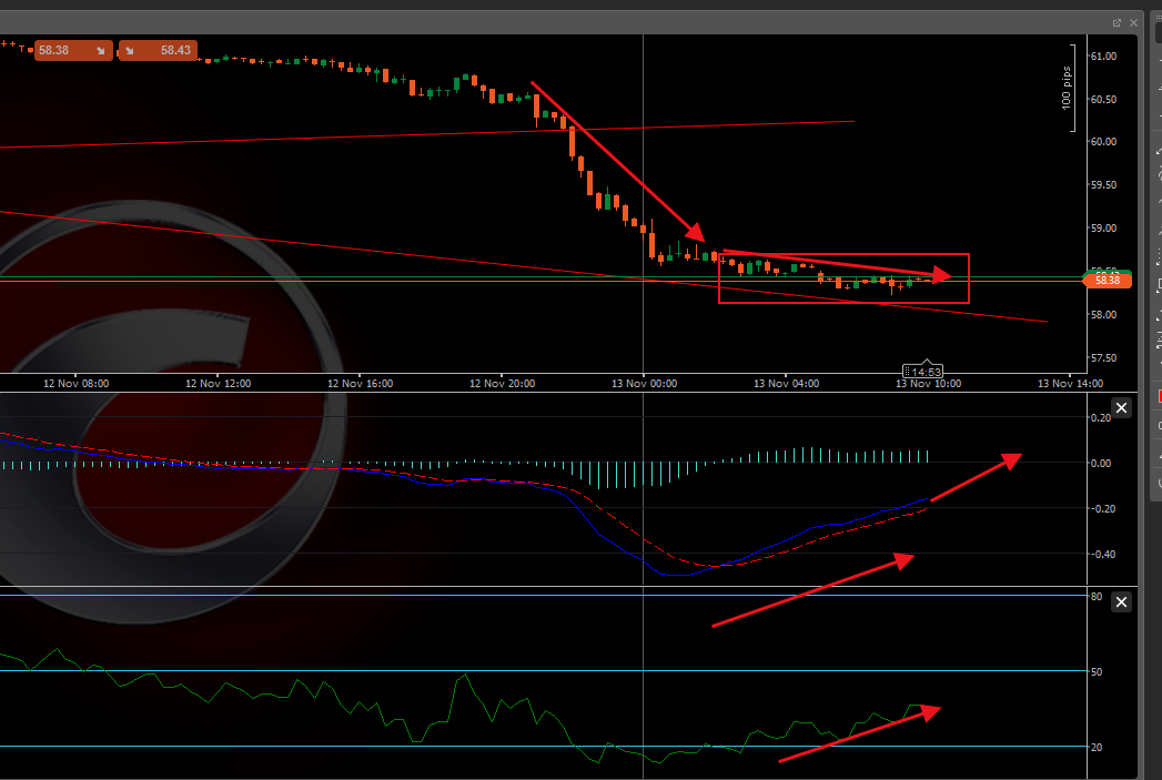 K线形态:经历暴跌后,今日上午的K线实体明显缩短,波动收窄,并在58.30 - 59.50美元区间内构筑了一个临时的震荡平台。这表明市场的短期卖压暂时缓解,多空双方进入短暂平衡。