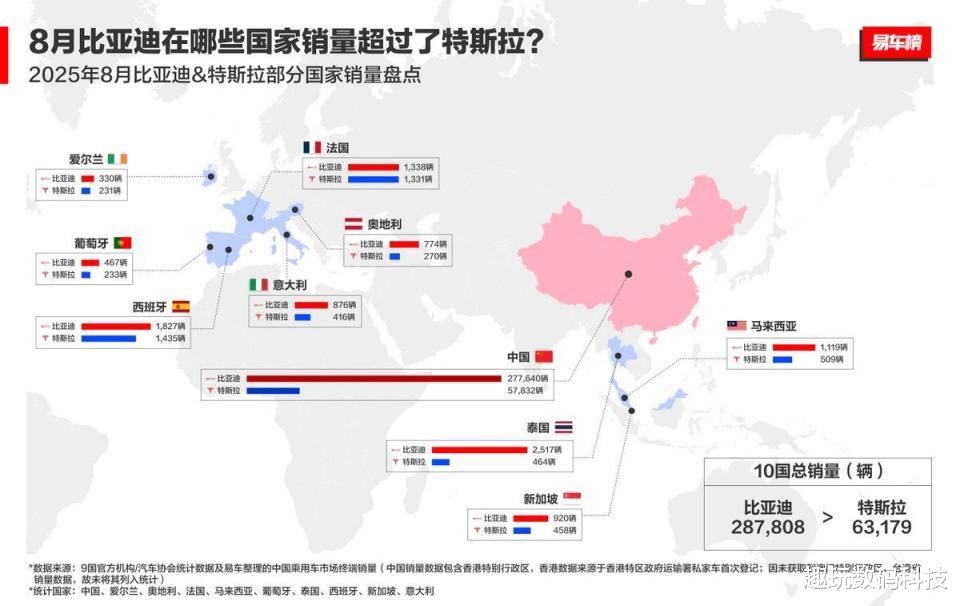 海外市场突飞猛进,全球化战略全面奏效今年1-9月,比亚迪海外销量突破70万辆。据易车数据显示,2025年8月,比亚迪在西班牙、法国、意大利、爱尔兰、葡萄牙、奥地利等欧洲国家,以及新加坡、泰国、马来西亚等东南亚国家,持续扩大领先态势,销量均超过了特斯拉。