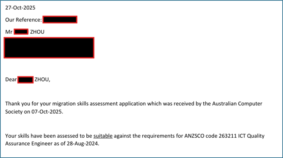 就在最近,一位客户以 ICT Engineer(信息与通信工程师)职位申请 186雇主担保签证(186类别),仅 2周时间就成功通过澳洲Australian Computer Society (ACS)协会职业评估: