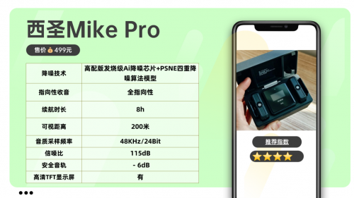 西圣Mike Pro走性价比路线,核心配置贴合入门创作需求。48kHz/24Bit采样搭配6mm全指向咪头,人声收音干净自然,日常口播、短视频录制时,语气细节和轻微气息都能较好还原。