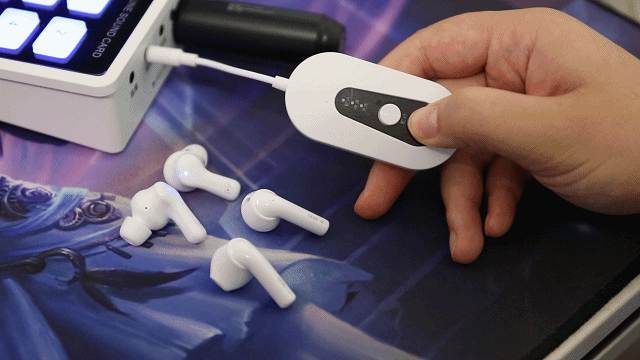 看下连接速度,发射器开机的一瞬间两台耳机可以说是秒连,不亏是全芯升级的三代低延迟2.4G技术,完全没有蓝牙那种拖沓和延迟。