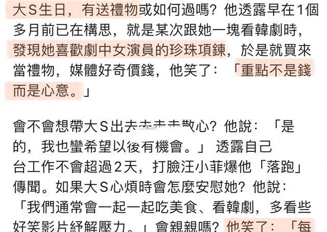 具俊晔表示,在大S烦心时,他也会陪她一起看韩剧、吃零食,看一些喜剧缓解压力,并直言“每天都会亲亲”。