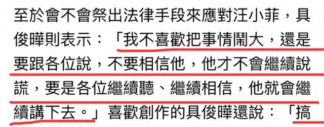 具俊晔表示,由于事关大S,具俊晔也强调,他不希望事情弄复杂,不会考虑透过法律途径去解决,但他希望大家不要相信汪小菲的谎话,“时间久了大家就知道是假的,他也就不会再说谎,大家越是继续听、继续信,他就越会继续讲下去”。