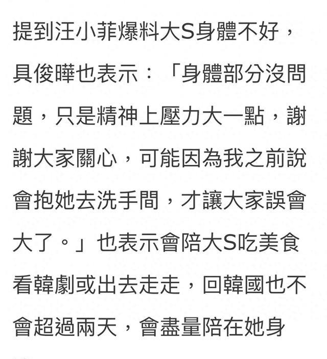 对此,具俊晔回应媒体称,大S身体没问题,只不过因为汪小菲的复婚等言论导致大S的精神压力很大,状态不是特别好。