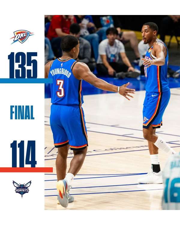 季前赛,卫冕冠军雷霆135-114大胜黄蜂。