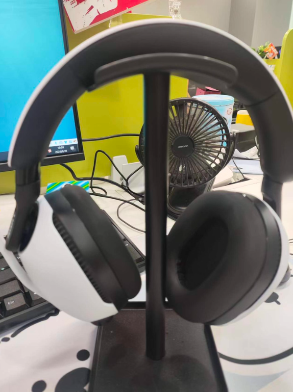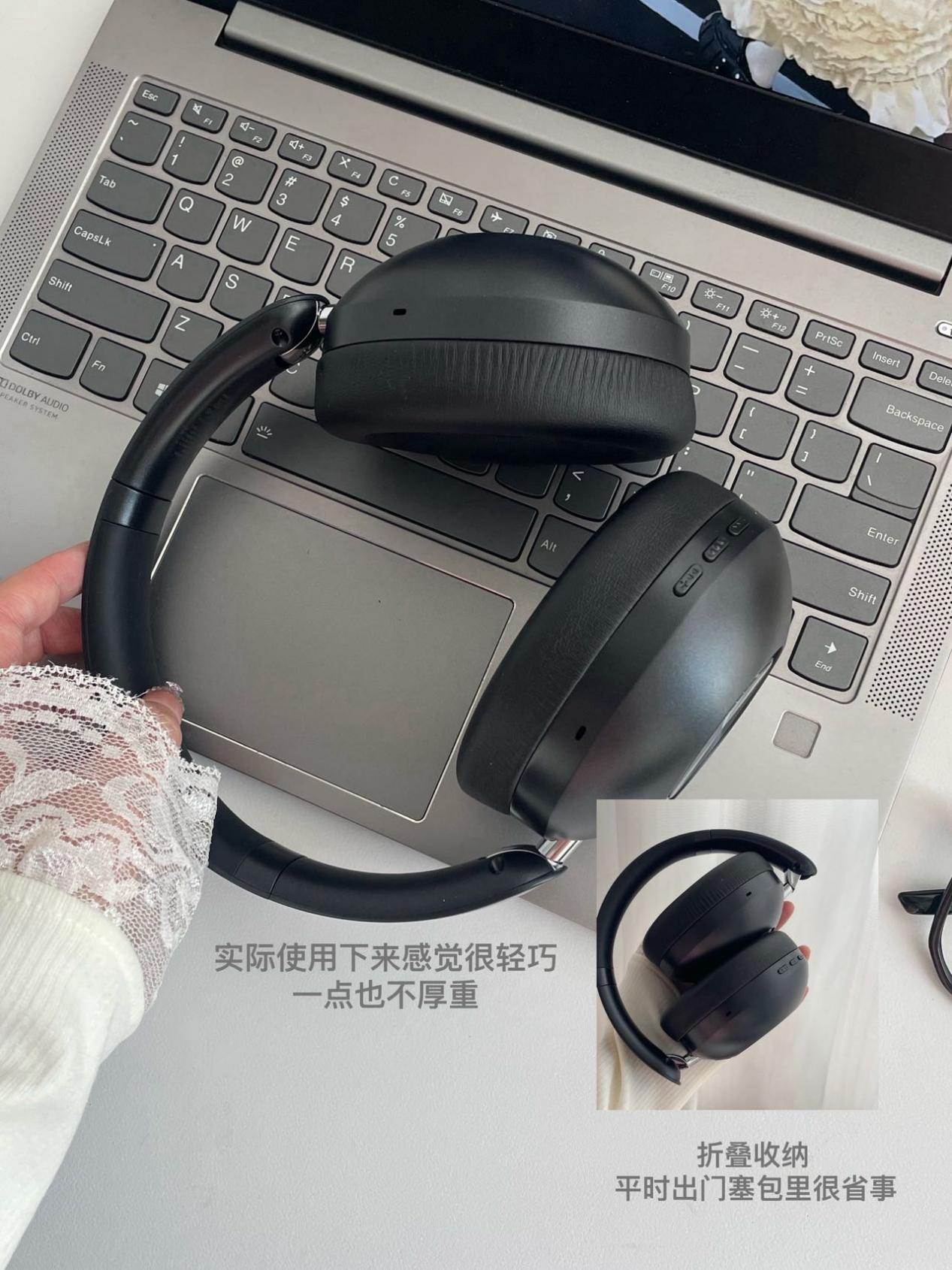 这款重量只有256克,拿在手里几乎没负重感,就算戴头上也能做到完全不压顶。头梁而且是可调节设计,大头围朋友拉到最大也不夹头了,小头围也能贴紧头部不晃。耳罩采用的是亲肤生物PU皮,里面塞的是高弹记忆海绵,按下去慢回弹,贴脸特别软,就算戴眼镜也不会让镜腿硌耳朵,我实测后戴它从上午9点到下午6点,耳朵周围既不闷也不痛了。