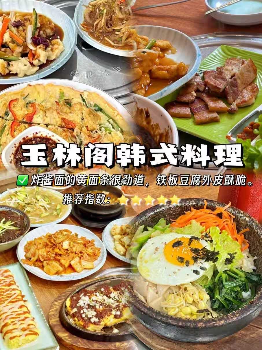 🍜玉林阁韩式料理:想吃韩餐可以来这家。炸酱面的黄面条很劲道,酱里炒了洋葱,香味很足,拌开后吃着很扎实。铁板豆腐端上来滋滋作响,外皮有点脆,里面软乎乎的,蘸着料吃咸香够味。小菜给得不少,整体吃着很满足🥢。