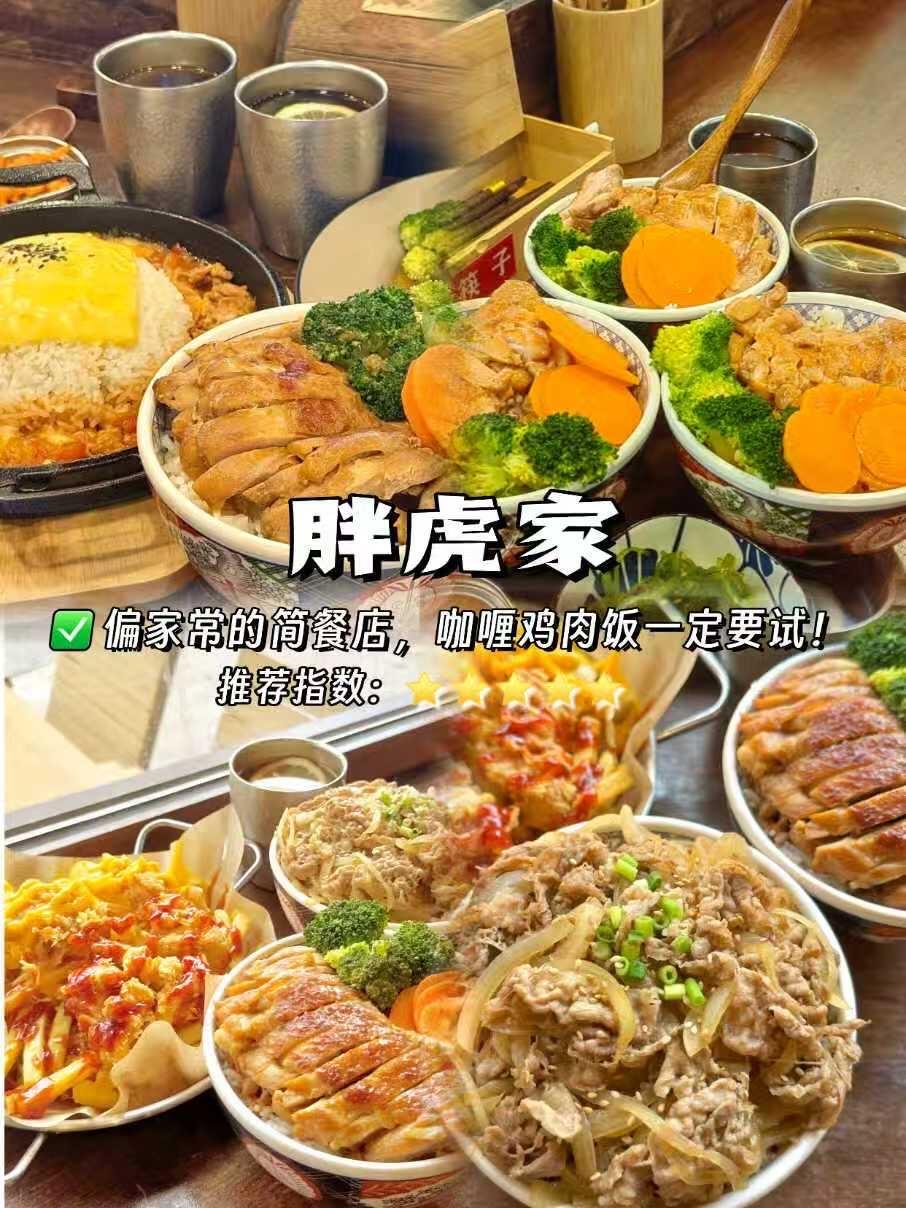 🥘胖虎家:偏家常的简餐店,咖喱鸡肉饭一定要试!咖喱熬得很浓郁,拌着米饭刚好,里面的土豆炖得软烂,鸡肉块也不小。装修是简约工业风,墙上贴了软萌贴画,反差感很可爱,吃着很放松😌。