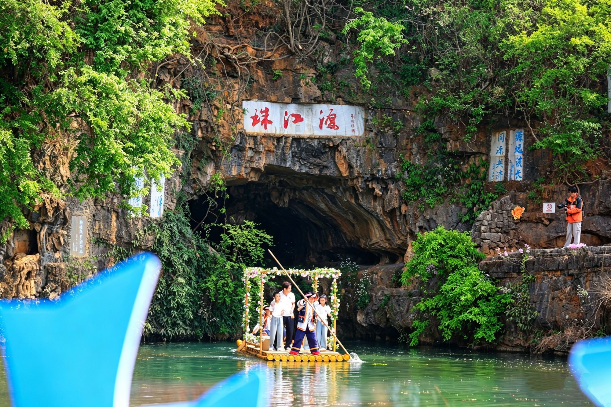 “珠江源”三个大字下的洞口被葱郁草木包裹,显得幽深神秘。乘竹筏进入洞中,可以近距离观赏形状各异的钟乳石,感受江水源头的清凉静谧。