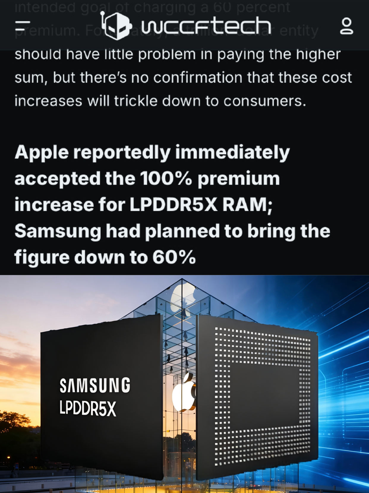 存储芯片大涨 30%,三星带头涨,之前还看到外媒发布的报道,称苹果接受了三星LPDDR5X内存100%的溢价上涨,苹果接下来的新机或许也要涨价了!