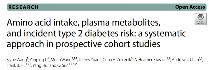 Wang S, Li Y, Wang M,et al. Amino acid intake, plasma metabolites, and incident type 2 diabetes risk: a systematic approach in prospective cohort studies[J]. Nutr J. 2025 Jul 16;24(1):112. doi: 10.1186/s12937-025-01157-x.