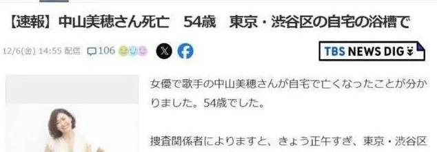 12月6日,曾主演过著名电影《情书》的日本女演员中山美穗,在日本东京涩谷区的家中去世,享年54岁。令人震惊的是,中山美穗的尸体是警方在接到报警后立即前往她的家发现的,而且,尸体是在浴缸里找到的。