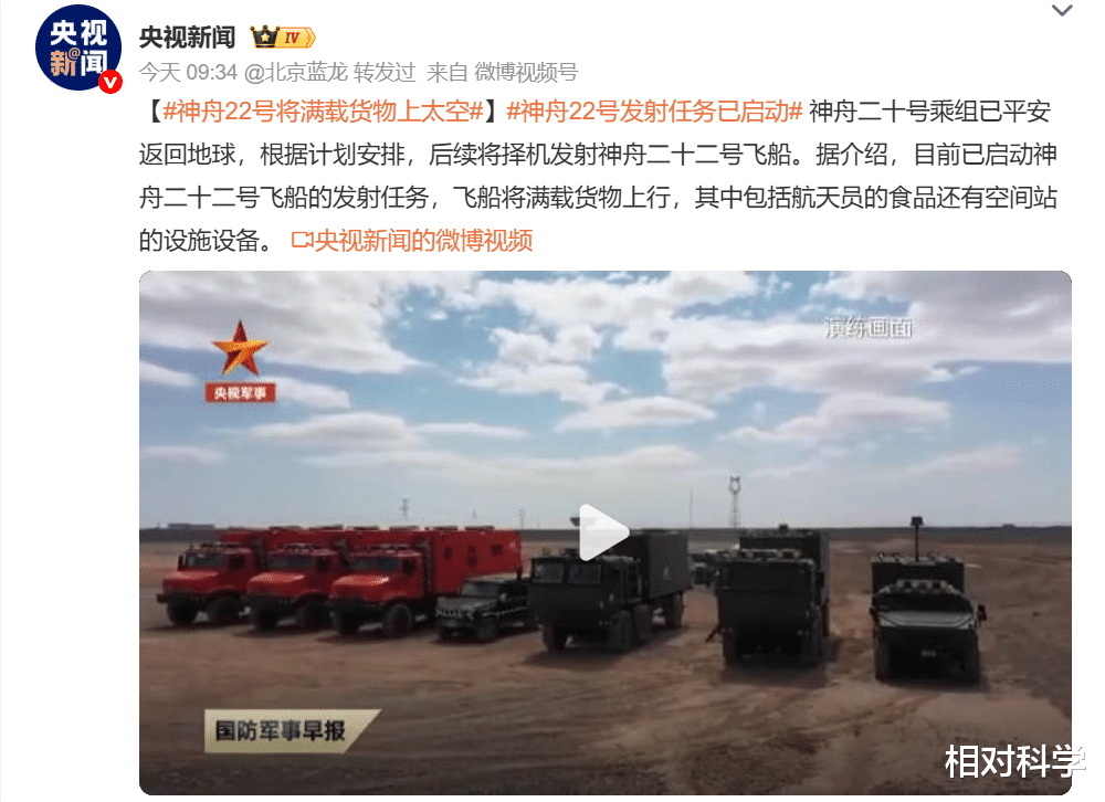 作为神二十一的备份飞船,神二十二早已在酒泉卫星发射中心待命。目前,神舟二十二号飞船的发射任务已经正式启动。此次任务,神二十二飞船将不载人,而是会满载货物上行。毕竟,神二十乘组延期返回9天,比预计多消耗了一些物资,所以神二十二正好可以带些补给物资到空间站上。