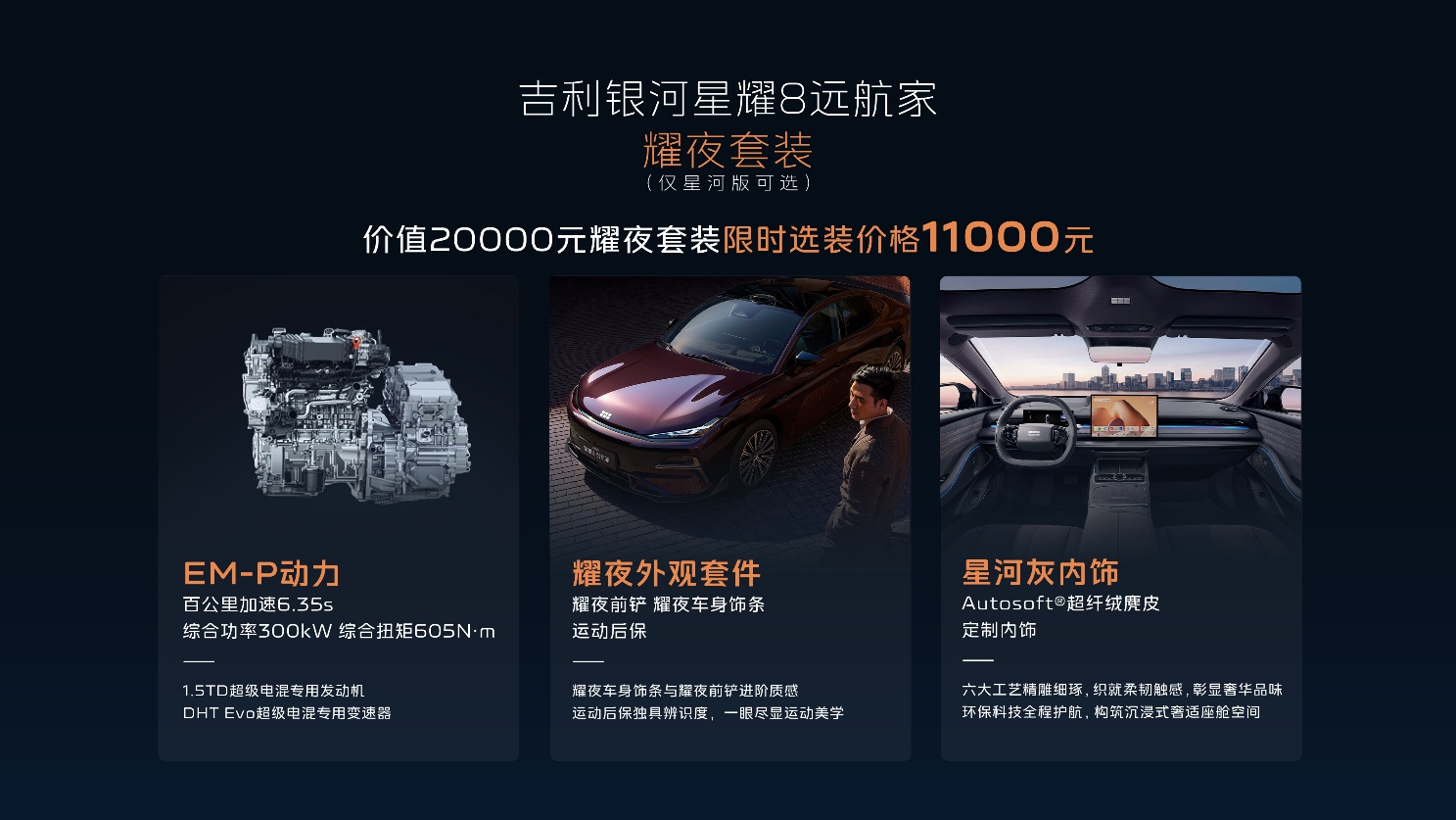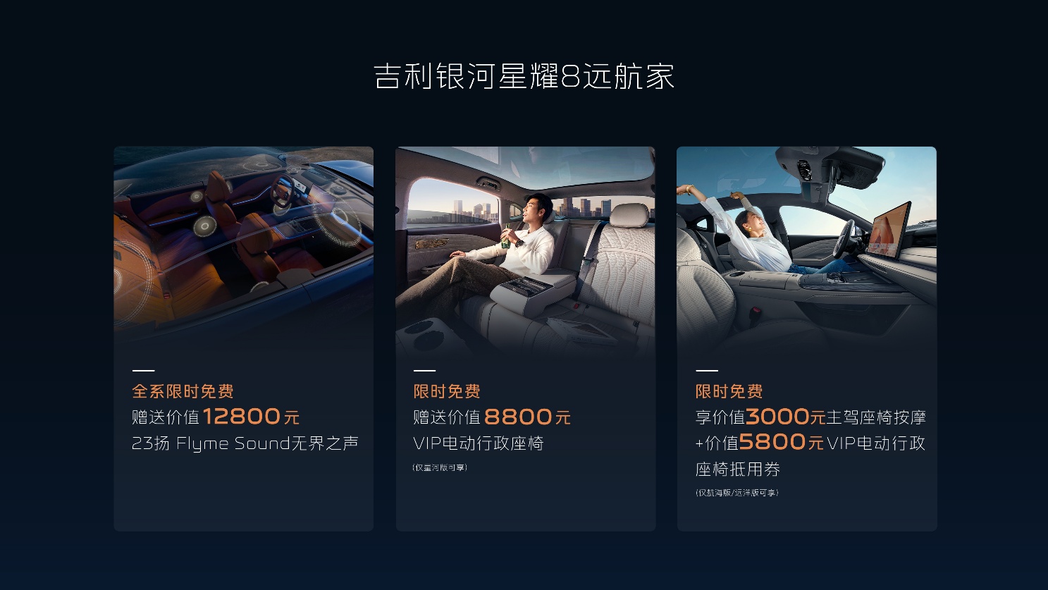 吉利银河星耀8远航家系列秉承“科技豪华平权,起步即旗舰”的理念,将越级舒享体验带入中高级轿车市场,让豪华触手可及。