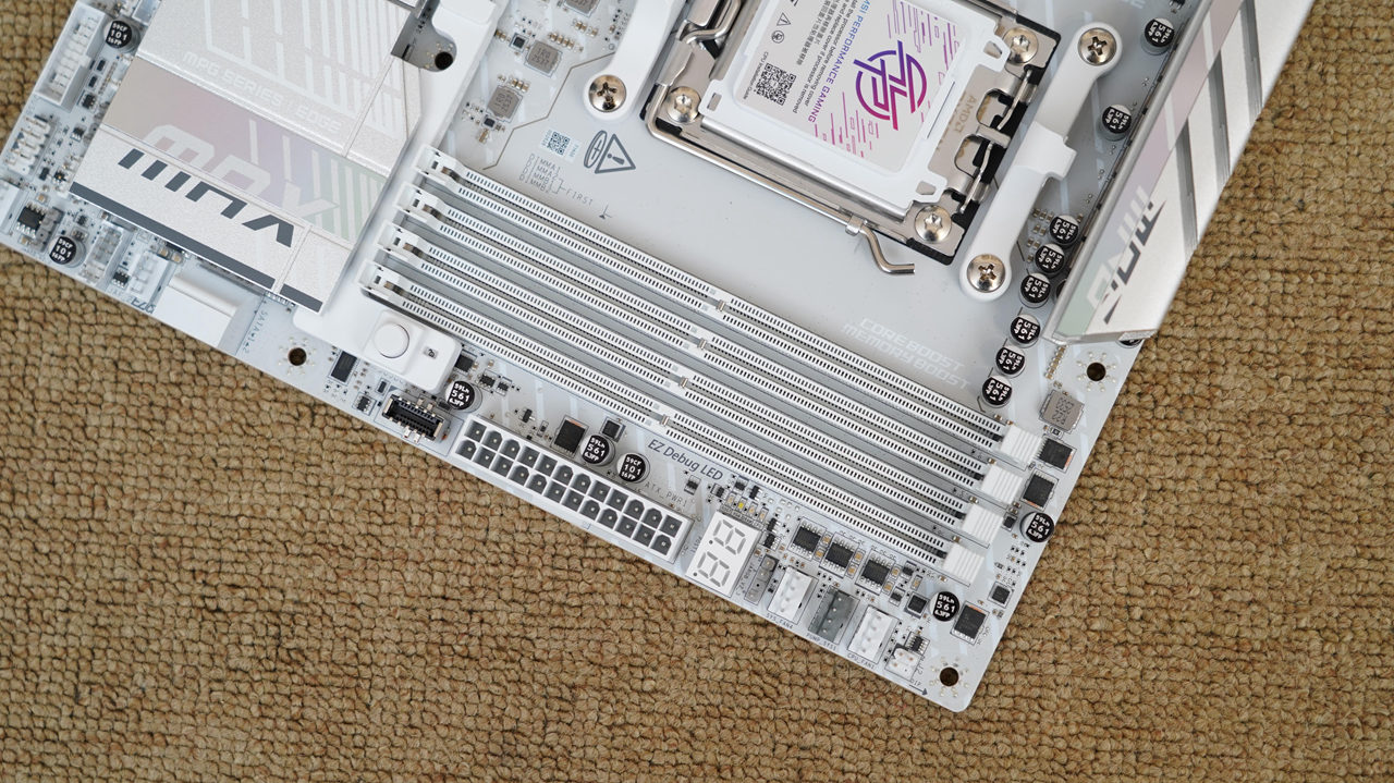 主板标配了四条白色DDR5内存插槽,最高支持8400MT/s+(OC)的频率,最大内存容量可支持到256GB,同时主板还支持微星Memory Boost技术,哪怕是小白玩家也能轻松玩转内存超频。