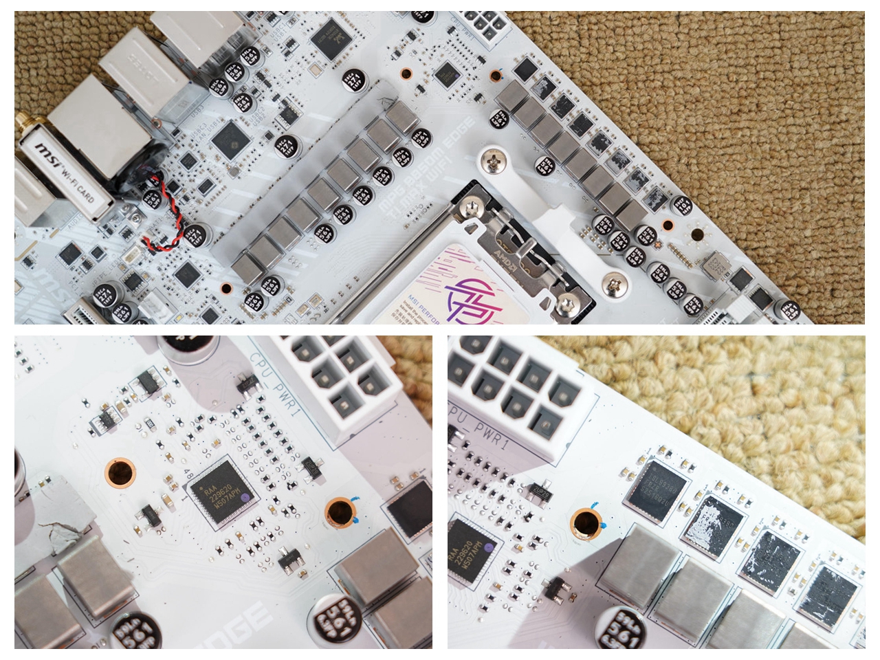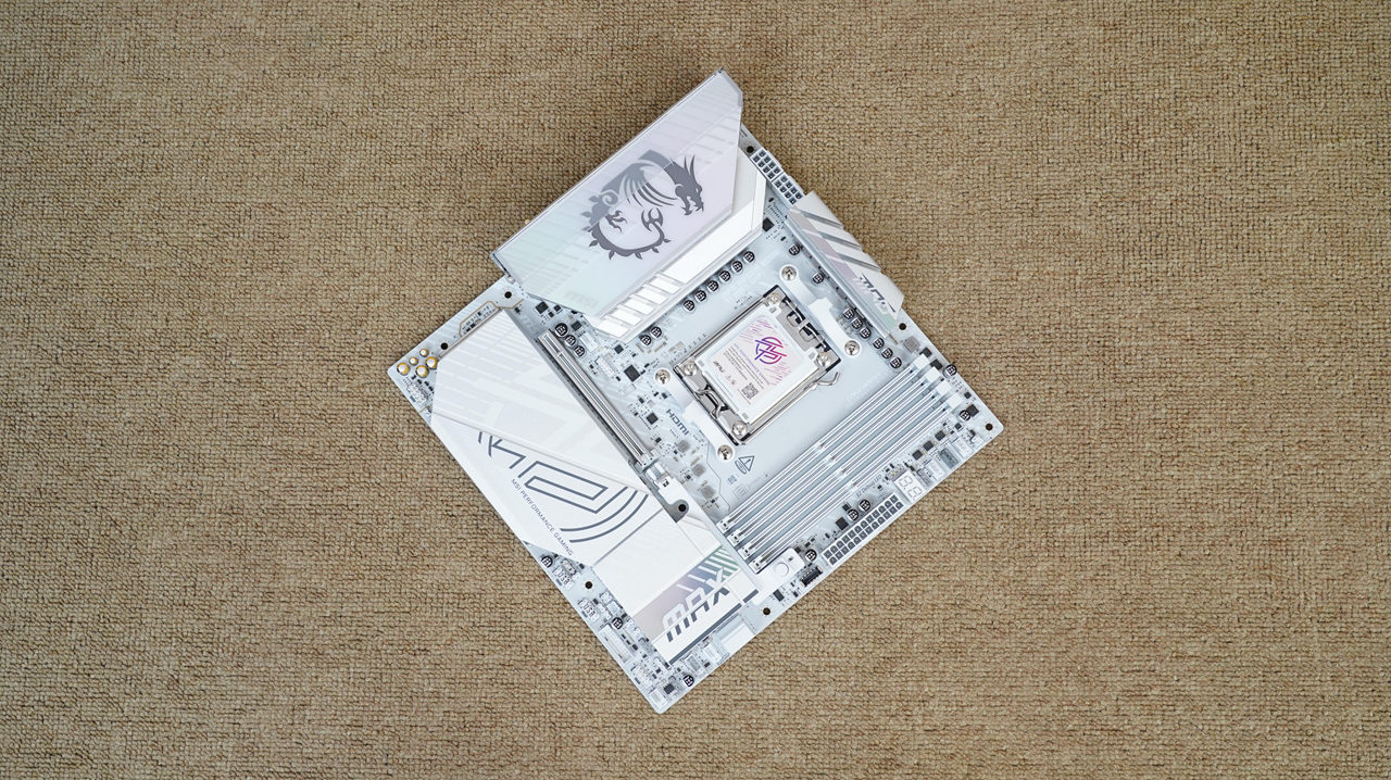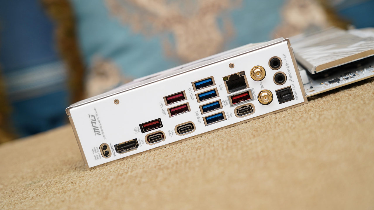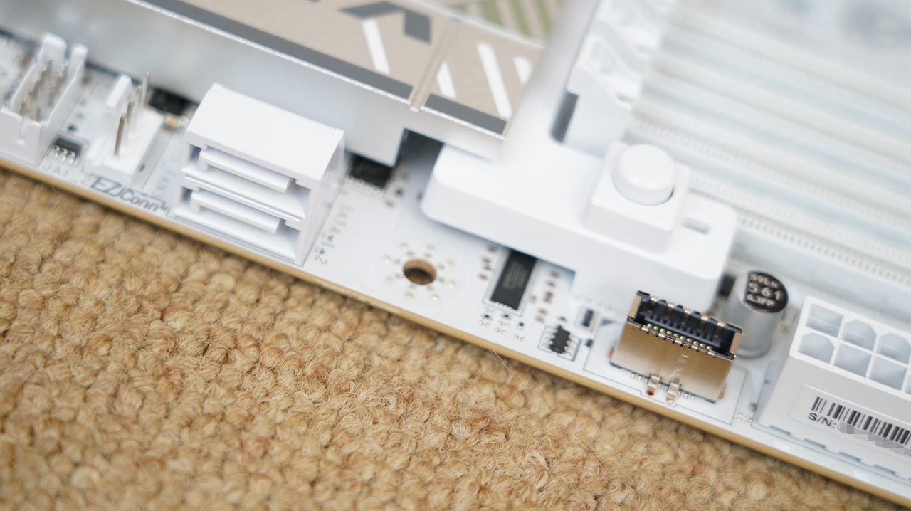 主板采用了白色一体式I/O挡板,接口也非常丰富,除了提供常规的HDMI、USB2.0接口、USB 5G接口、USB 10G接口及音频接口外,还提供了BIOS清除按键、BIOS回写键、3个USB 10Gbps Type-C接口、5G网口及WiFi7天线等。