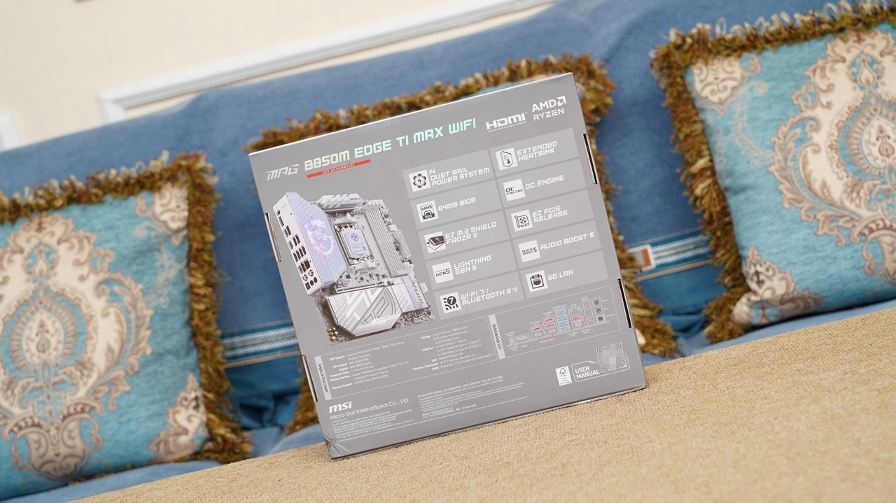 微星 MPG B850M EDGE TI MAX WIFI刀锋钛采用了简约复古的外包装风格,给人一种沉稳扎实的感觉。