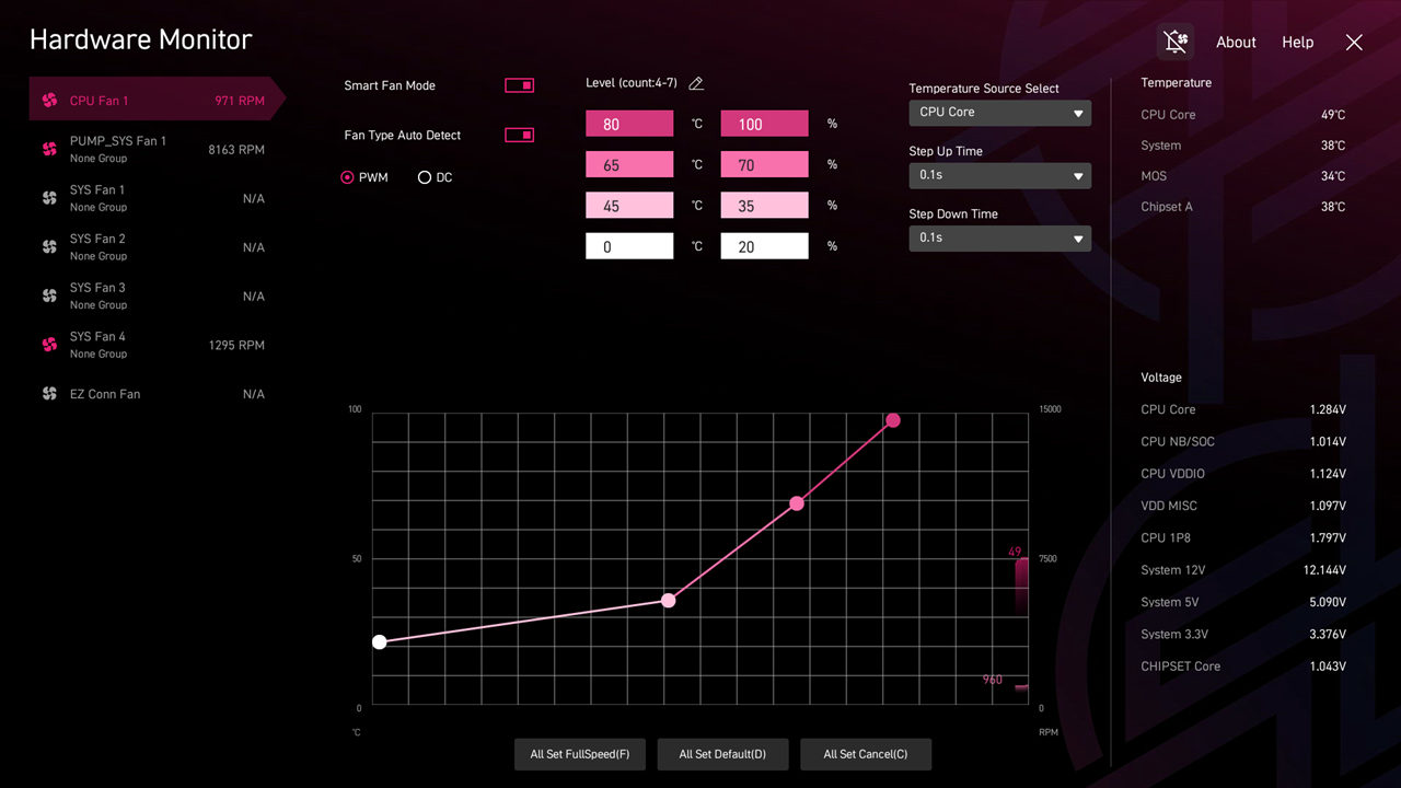 风扇曲线调节界面一览,玩家可根据自己的散热器性能及噪音耐受度来调整更适合自己的风扇策略。