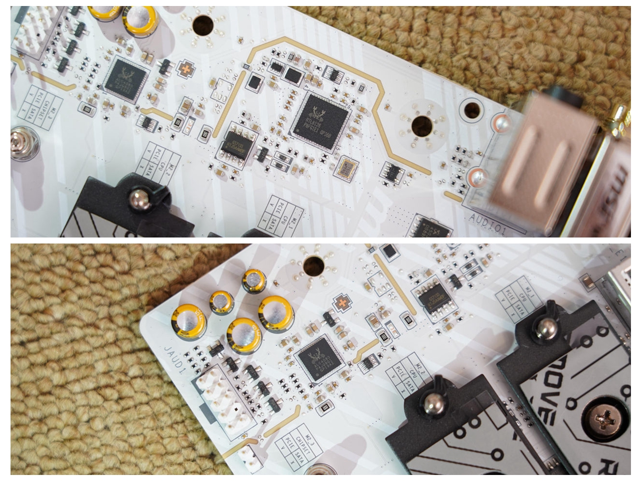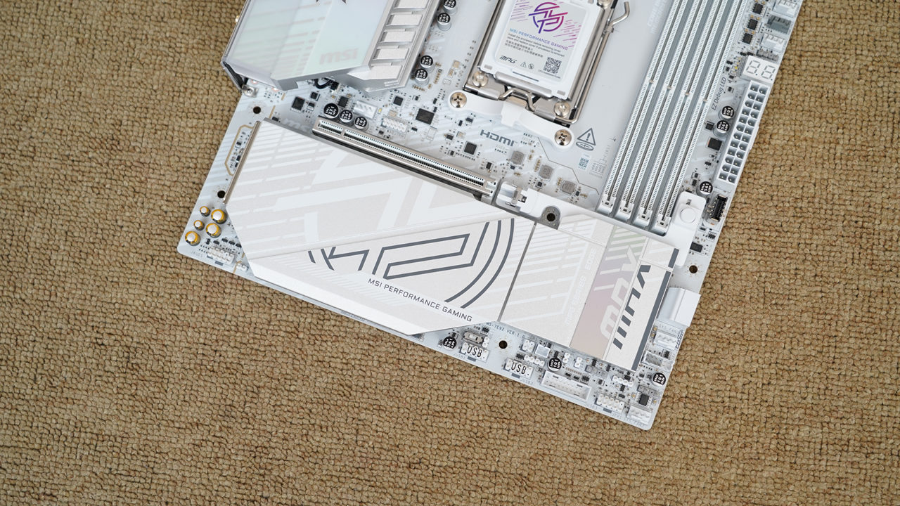 主板下半部分也采用了银色全装甲覆盖,质感和颜值都非常不错,并提供了1条PCIe 5.0 ×16钢铁装甲设计的显卡插槽(CPU)。