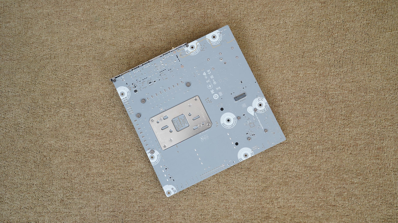 拿掉散热片可以看出,主板提供了3个M.2接口,其中2个PCIe 5.0 ×4 M.2接口,1个PCIe 4.0 ×4 M.2接口。另外,主板背面还提供了一个M.2接口,总计4个M.2接口。