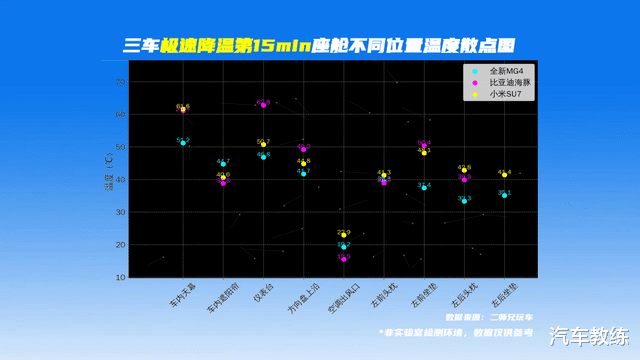 那么在15分钟以后,全新MG4的后排温度,率先降低到35度左右,比SU7和海豚压凉快不少。当SU7和海豚在打开空调20分钟后,它们的温度才追赶得上全新MG4的温度。综合来看,MG4的空调是三款车之中最给力的。