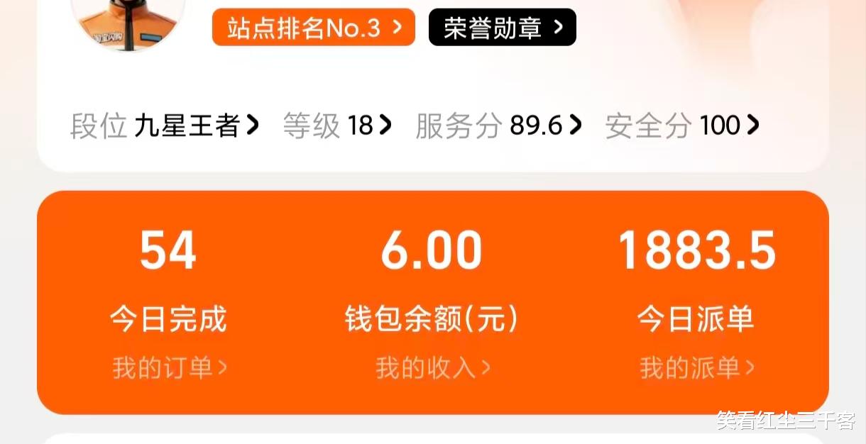 她还给我看了她昨天的跑单战绩,站点排名第三,上线九个小时,完成54单,其中6元是顾客赠送的小费,估计是顾客看她是个女骑手,不容易,一定要给小费表示感谢吧!