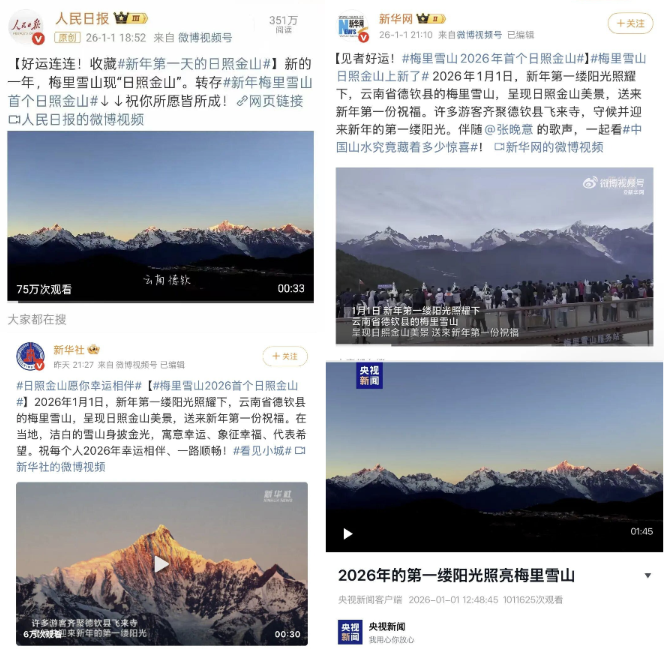 梅里雪山的“日照金山”有多出名?据了解,早在元旦假期前,德钦县飞来寺等最佳观景地附近的酒店就已基本满房。许多游客专程前来,只为在海拔3400米之上,与梅里雪山共同迎接新年的第一缕曙光。而梅里雪山的飞来寺观景台在当日的单日游客量超过1万人次。