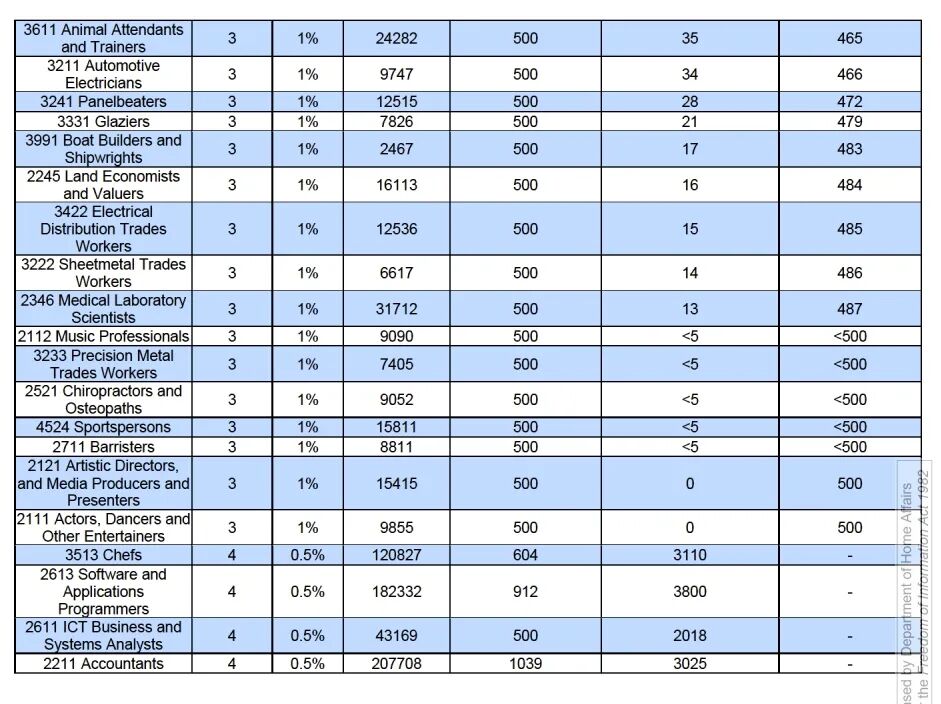 根据移民局提供的信息,目前的邀请职业详细划分为4个层级,有不同的配额上限设定比例:Tier 1(4%)、Tier 2(2%)、Tier 3(1%)、Tier 4(0.5%)。