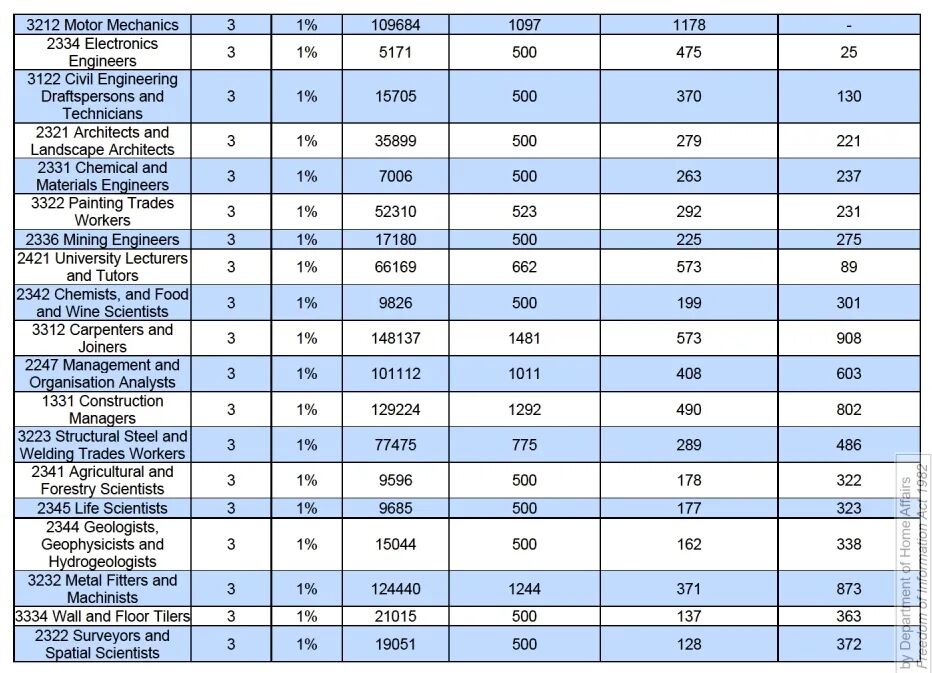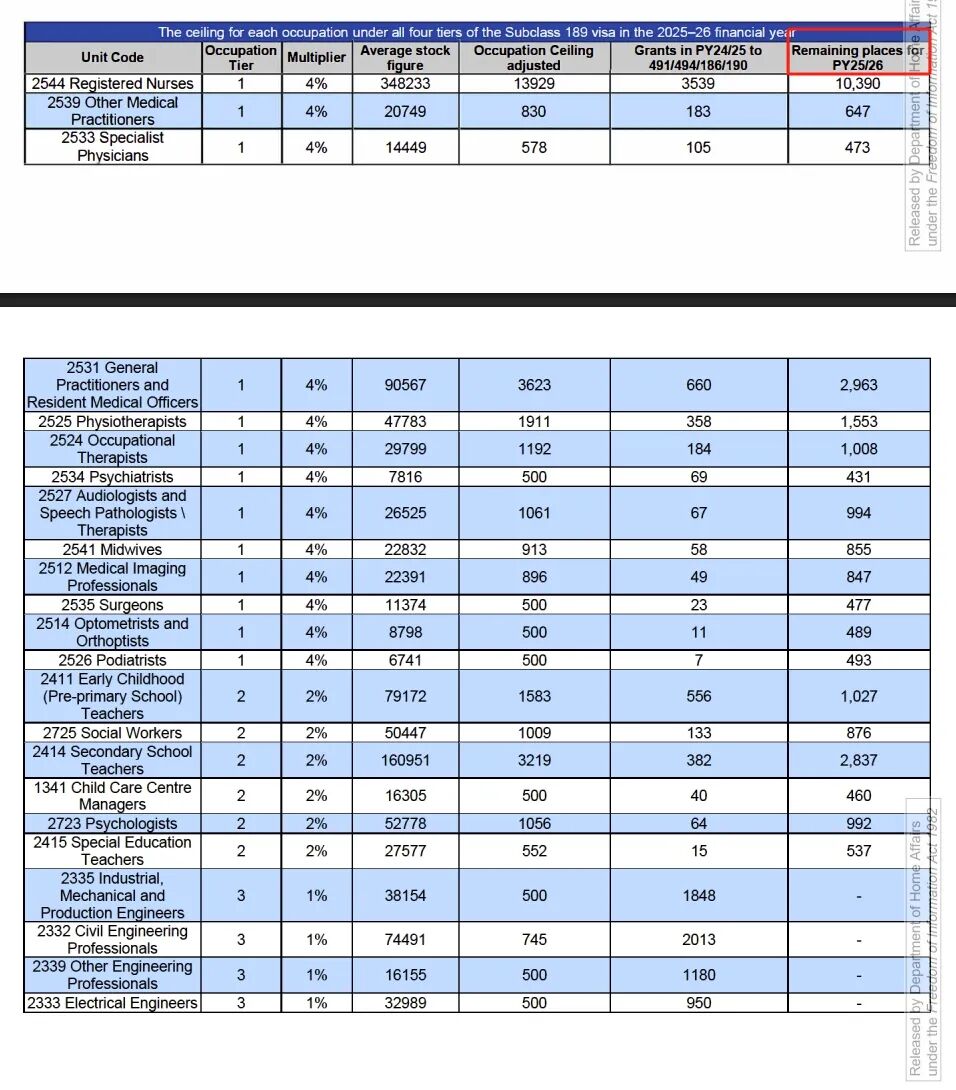 澳洲移民局近期,公布25-26财年澳洲独立技术移民189邀请上限数据(Occupation Ceiling)。