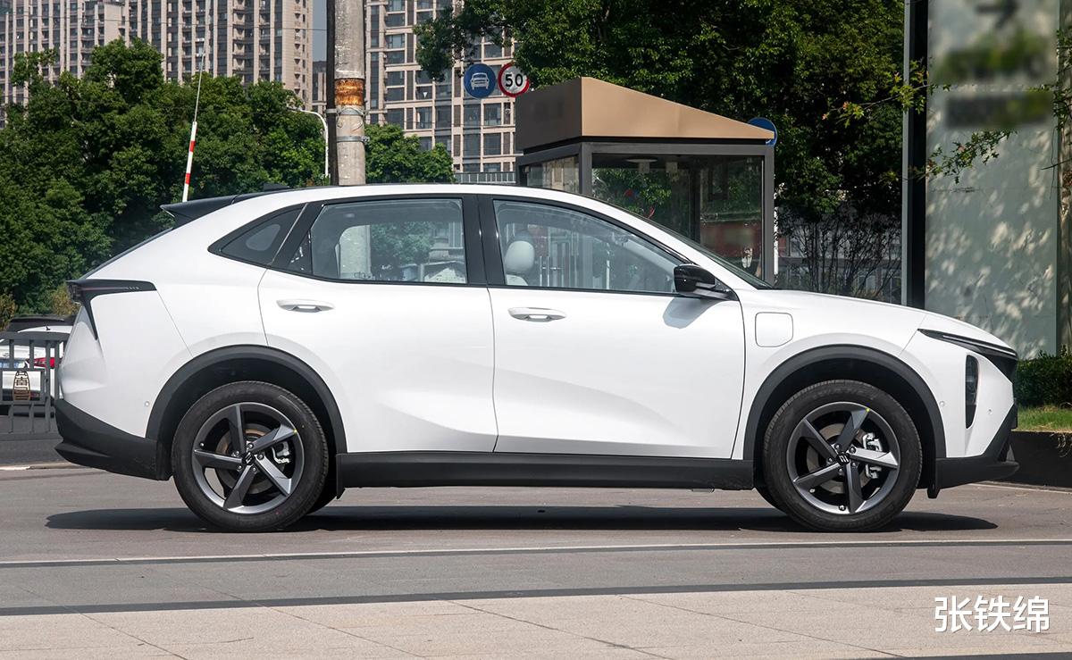 车身侧面是轿跑式的造型轮廓,整体造型很简洁,车门把手为传统的外拉式,车门下部带有两条折痕式的筋线装饰,黑色的轮眉和下包围增加了层次感。车身尺寸方面,新车的长宽高分别为4640/1870/1685mm,轴距为2770mm。