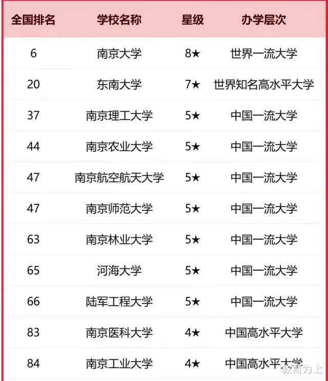 通过对南京市高校综合实力进行量化评比,可划分为8星级、7星级、5星级等级别,其中南京大学、东南大学、南京理工大学居榜单前3名,是南京市综合实力最好的大学,分别居全国高校第6名、第20名、第37名。