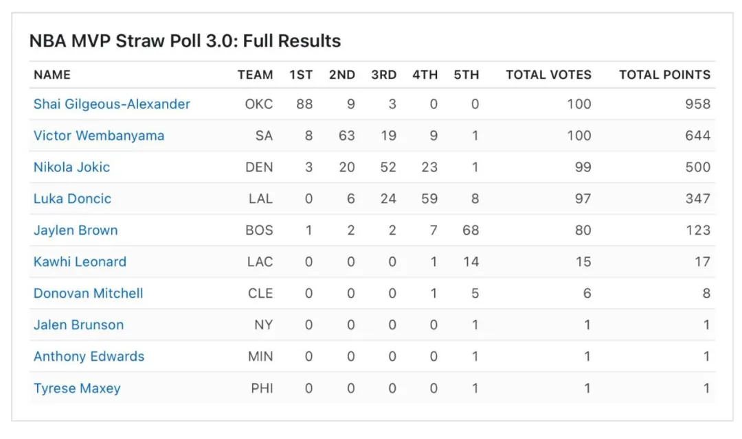 尽管NBA官方最新一期的MVP榜里,文班亚马依然是榜首,但是此前ESPN的模拟投票结果,亚历山大收获了88张第一选票,文班亚马只有8张,两人差距巨大。