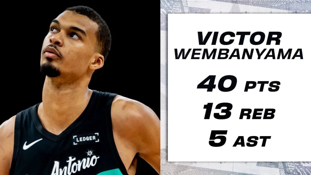 这场比赛,文班亚马复出,然后再次交出炸裂表现:全场只打了26分钟,投篮23中14,三分7中2,罚球11中10,得到40分13篮板5助攻2盖帽1抢断。