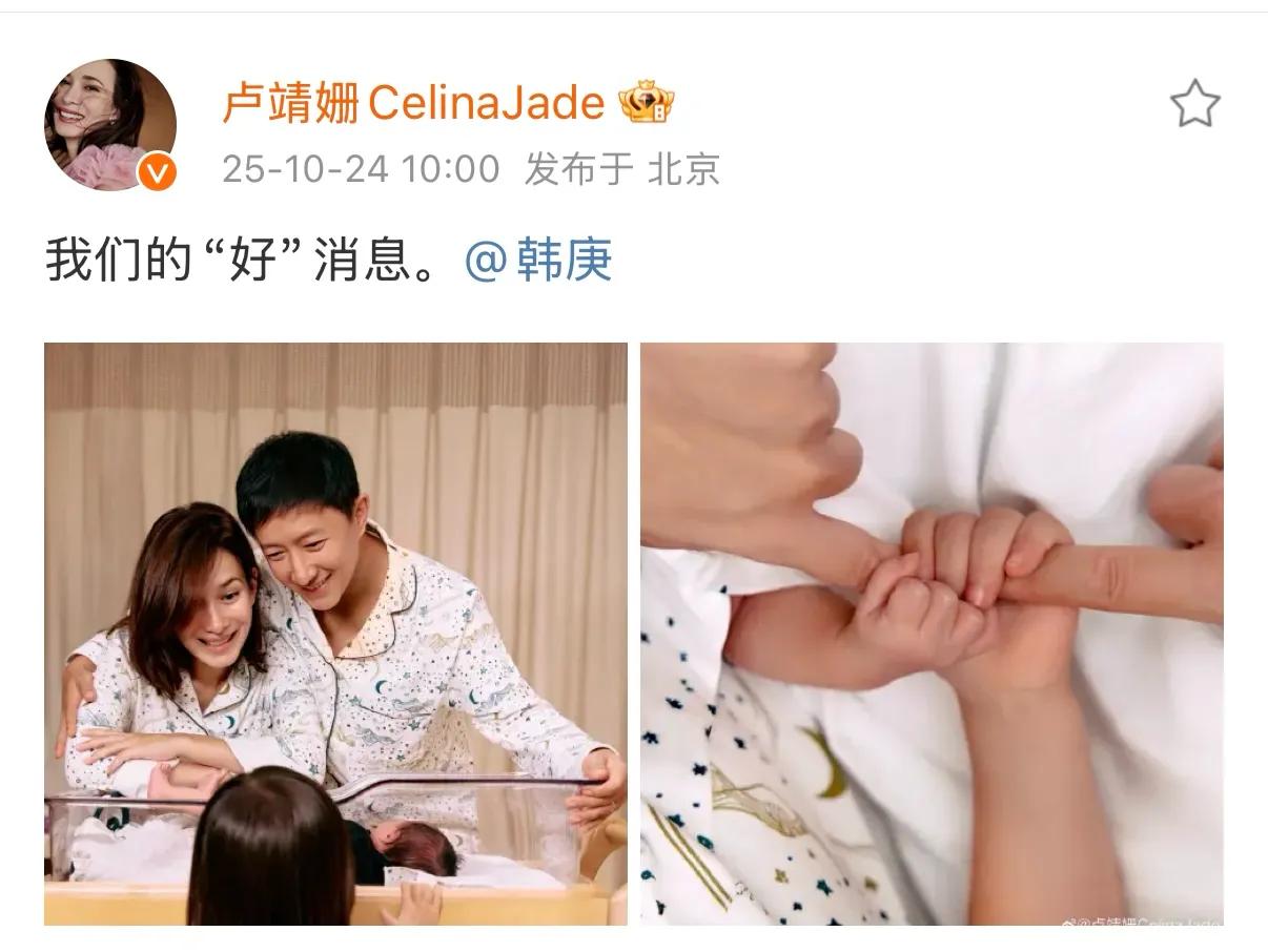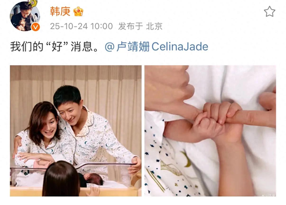 10月24日,韩庚卢靖姗在社交平台晒出一家四口合照,并配文:“我们的‘好’消息”,官宣二胎得子,凑成“好”字。恭喜!