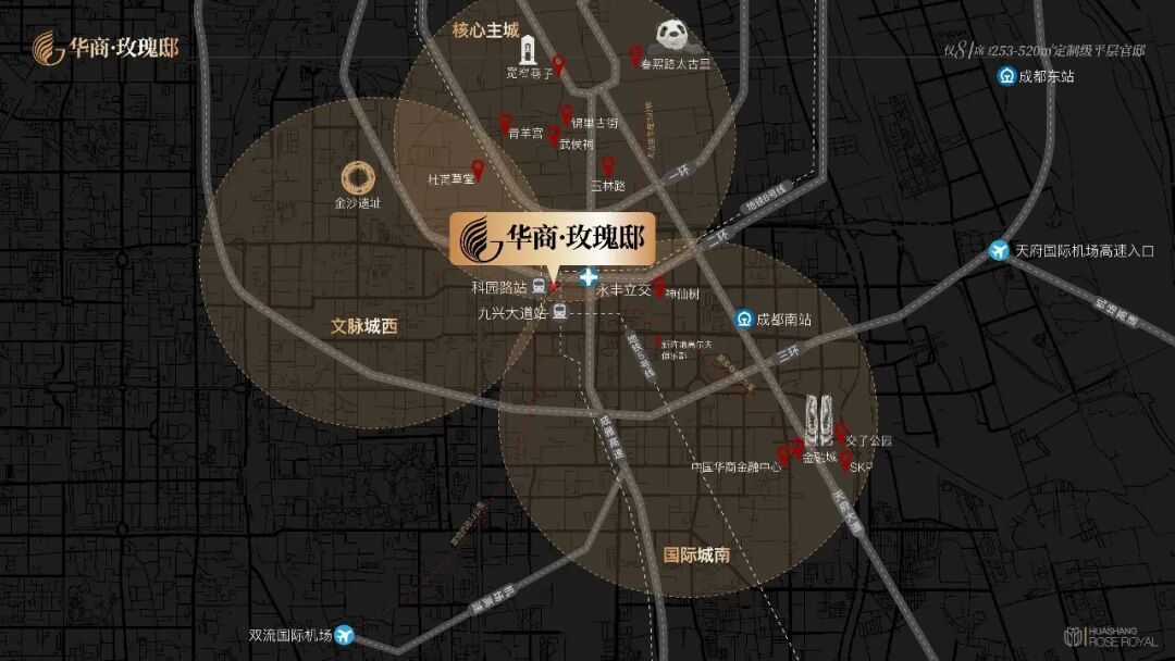同时,华商玫瑰邸占位南二环,这里是被《成都》唱响的城市极核。作为精英人群的5A级时间效率枢纽,项目依托二环及高架路网,畅达双流国际机场,高效出行。