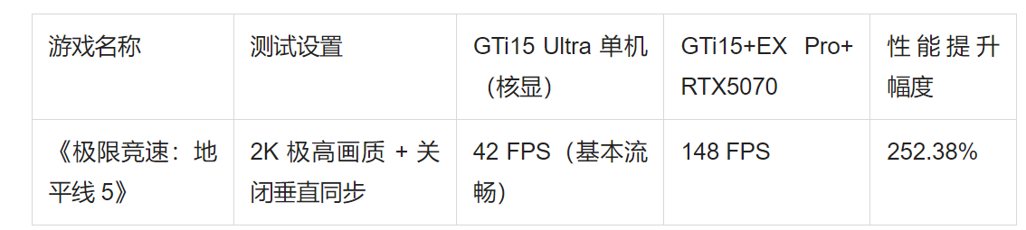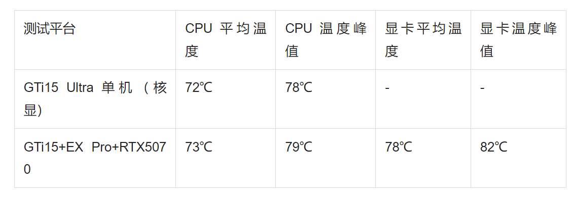 通过实际测试数据表现来看,零刻GTI15 Ultra+七彩虹iGame RTX 5070 的外接显卡模式下,148fps 的平均帧率让高速竞速时的 “画面撕裂” 问题彻底消失。配合 GTi15 Ultra 的万兆网口,可流畅加载在线多人地图,,整体体验完全满足竞速游戏的沉浸需求。外接显卡坞后,CPU 温度仅上升 1℃,峰值温度上升 1℃, 这是因为 EX Pro 显卡坞采用 了180W电源适配器的“独立供电设计”,显卡功耗完全由坞站承担,不会占用主机的供电资源。而 iGame RTX 5070 火神显卡的平均温度 78℃,处于安全范围内,高负载下也没有出现因为过热而导致降频的现象发生,非常稳定。