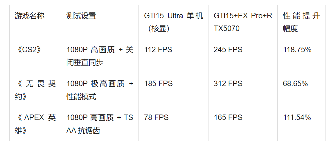 实际游戏表现,我们这次分别在零刻GTi15 Ultra的核显模式下和外接了七彩虹iGame RTX 5070 火神显卡的独显模式下来测试实际零刻GTi15 Ultra迷你主机在大型3A游戏方面的表现。