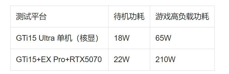 而在整机功耗方面,核显模式下,待机功耗为18W,游戏负载功耗下为65W,显卡坞外接七彩虹iGame RTX 5070火神显卡模式下,待机功耗为22W,高负载模式下功耗为210W。待机下仅比单机多 4W 功耗;高负载时,210W 的整机功耗虽比单机高,但结合性能提升幅度来看,这点功耗提升,在能效比表现方面更加出色,适合对游戏性能要求极高,长期使用。