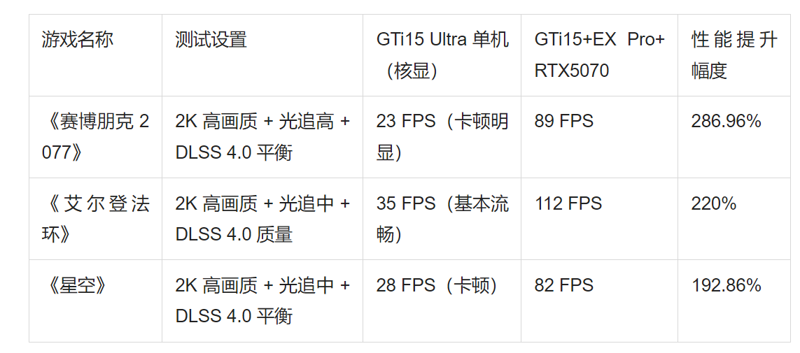 对于《赛博朋克 2077》《艾尔登法环》这类对显卡性能要求较高的 3A 游戏,RTX 5070 的光追能力与 EX Pro 的传输稳定性成为关键。本次测试开启 “光追高 + DLSS 4平衡” 模式,兼顾画质与帧率: