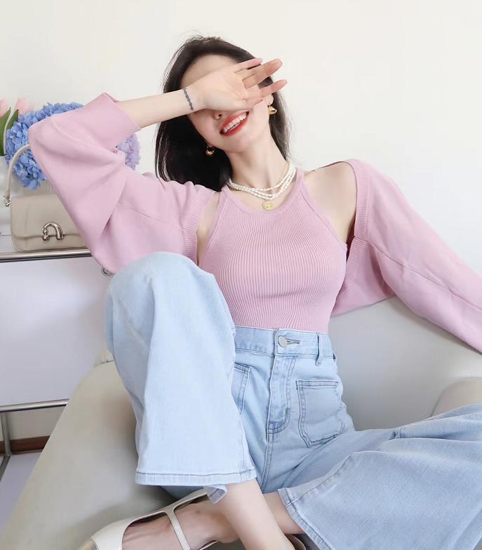 可以单穿,亦可以进行叠穿,像这位博主就选择了一件白色小背心作为内搭,粉色+b白色的组合,很减龄,搭配牛仔蓝阔腿裤来配,上下装的配色超级友好的,和谐度满满~